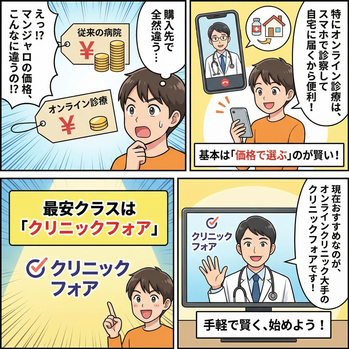 特にオンライン診療では、スマートフォンでの簡単な診察だけで自宅に薬が届くため、基本的には 「価格で選ぶ」 のが賢い方法といえるでしょう。