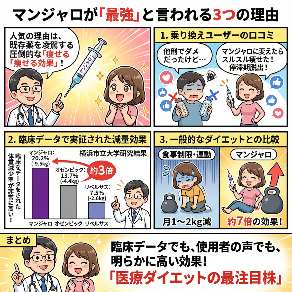 こうしたデータと実際の体験談が重なり、マンジャロが「医療ダイエットの中でも最注目」とされるのも納得です。