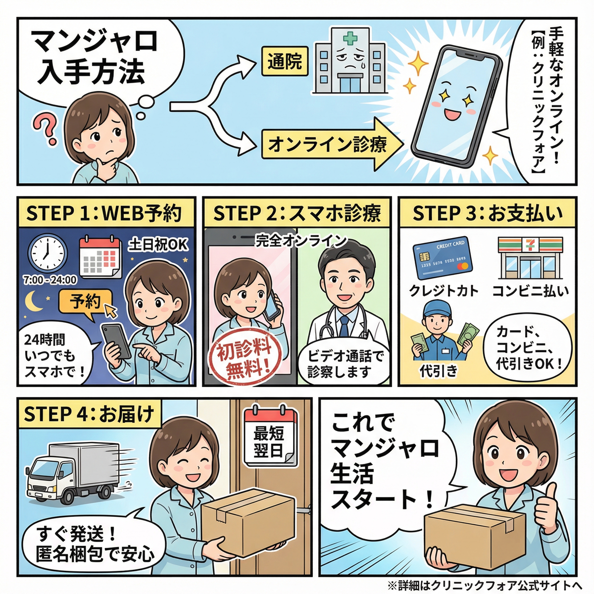 マンジャロの入手方法とオンライン診療の流れ【クリニックフォアの例】