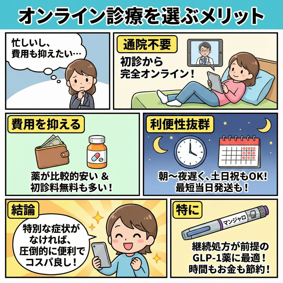 このように、特別な症状がなければ オンライン診療は圧倒的に便利でコスパの高い選択肢 です。特にマンジャロのように継続処方が前提となるGLP-1薬では、オンライン診療を利用することで 時間もお金も大きく節約 できます。